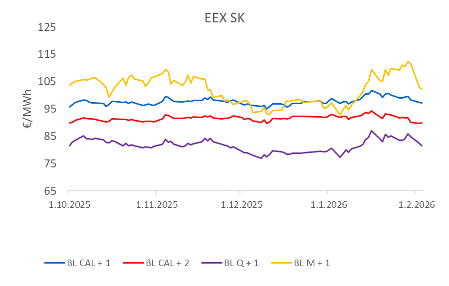 Veľmi silným impulzom bol mráz v kontinentálnej Európe – v Nemecku okolo -3,9 °C (výrazne pod normálom) a ešte výraznejšie v krajinách strednej a východnej Európy. Na spote dominovala kombinácia nízkej výroby z vetra – „dunkelflaute“, vysokého dopytu a regionálnych úzkych miest v prenosovej sústave. V juhovýchodnej Európe vznikala výrazná prémia voči západu, pričom viaceré prenosové sústavy zaznamenali rekordy vo fyzických zaťaženiach siete.Trh tak videl, že napätie nie je len o komoditách, ale aj o fyzike siete. Slovenský trh bol súčasťou tejto regionálnej prémie, keďže obmedzené cezhraničné kapacity nedokázali plne vyrovnávať rozdiely medzi západom a východom kontinentu.