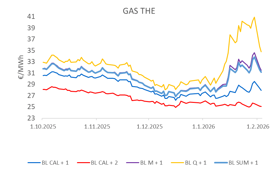 Trh vstupoval do nového roka po mimoriadne chladnom závere roku 2025,čo spôsobilo výraznejší než očakávaný úbytok zásob ešte pred začiatkom hlavnej zimnej sezóny. Už začiatkom mesiaca sa ukázalo, že geopolitika nemusí automaticky zdvíhať ceny plynu: americké útoky na Venezuelu trh s plynom prakticky odignoroval, keďže krajina sa na globálnych dodávkach ropy a plynu podieľa menej ako 1 % a trh rovnako tak slabo reagoval na vývoj situácie na Ukrajine a ďalšie kroky americkej administratívy ohľadom Grónska či hrozieb v colnej politike.