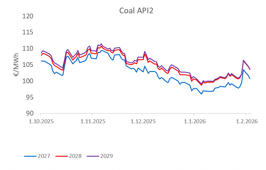 Na rozdiel od ropy, uhlie reagovalo viac na regionálne fundamenty. Ťažilo z kombinácie chladného počasia a vyššieho využitia tepelných elektrární, najmä v obdobiach, keď obnoviteľné zdroje nedokázali pokryť dopyt. Aj keď bol plyn počas nestudenších periód stále konkurencieschopný, uhlie si udržiavalo pozíciu dôležitého zdroja v energetickom mixe.