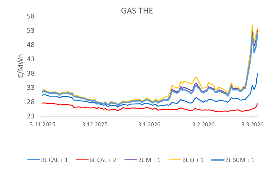 Útoky na iránske ciele, následná odveta a faktická blokáda Hormuzského prielivu, ktorým prechádza približne pätina svetového obchodu s ropou a významná časť LNG, vyvolali prudký rast cien plynu aj elektriny.Európske veľkoobchodné ceny plynu vyskočili o viac než 20 % aprodukty na rok 2026 zaznamenali historicky vysoké denné objemy obchodovania. Rast cien plynu sa okamžite premietol do cien elektriny, najmä v krajinách s vysokým podielom plynových elektrární.