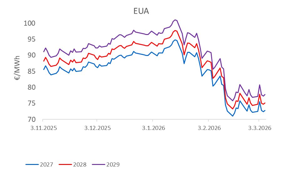Vo februárových týždňoch ceny elektriny reagovalinajmä na pokles cien emisných povoleniek. Referenčný kontrakt EUA Dec-26 klesol zo začiatku februára z úrovní nad 80 EUR/t postupne až na viacmesačné minimum okolo 68 EUR/t. Hlavným dôvodom bolipolitické signály o možnej revízii systému ETS vrátane úvah o spomalení tempa znižovania emisných stropov či rozšírení bezplatnej alokácie povoleniek po roku 2034.Tieto správy vyvolali výpredaj zo strany investičných fondov a stiahli nadol aj forwardové ceny elektriny, ktoré dosiahli štvortýždňové minimá.
