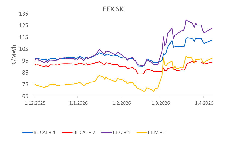 Pre Slovensko bol vývoj navyše citlivý aj pre regionálne riziká okolo ropovodu Družba a stav ropnej núdze. Keďže slovenský trh je súčasťou prepojeného európskeho trhu, domáce veľkoobchodné ceny elektriny reagovali najmä na európske ceny plynu, emisných povoleniek a celkovú geopolitickú rizikovú prémiu. Začiatkom apríla trh síce krátko zareagoval upokojením po oznámení dvojtýždňového prímeria medzi USA a Iránom, no neistota ostáva vysoká a ceny budú reagovať na akúkoľvek správu, ktorá naznačí vývoj situácie v najbližších týždňoch.