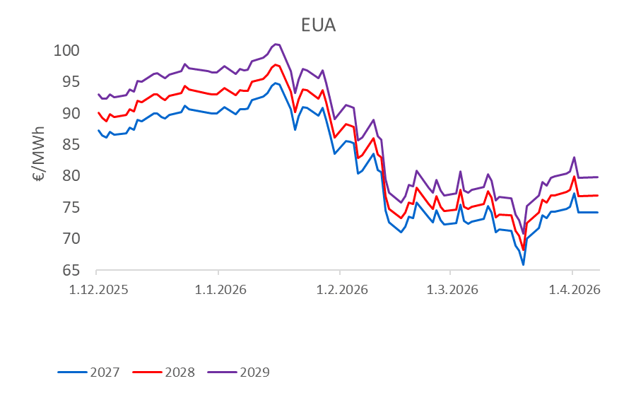 Pre elektrinu zostáva dôležitý aj vývoj emisných povoleniek EU ETS.Počas marca ich cena výrazne kolísala podľa správ o možnom uvoľnení pravidiel, zásahoch do rezervy stability trhu a debatách o pomoci priemyslu. Pokles cien EUA dočasne zmierňoval rast cien elektriny, no neskôr, keď EÚ neprišla s okamžitými razantnými opatreniami, povolenky opäť zdraželi a začali sa znovu premietať do cien elektriny.